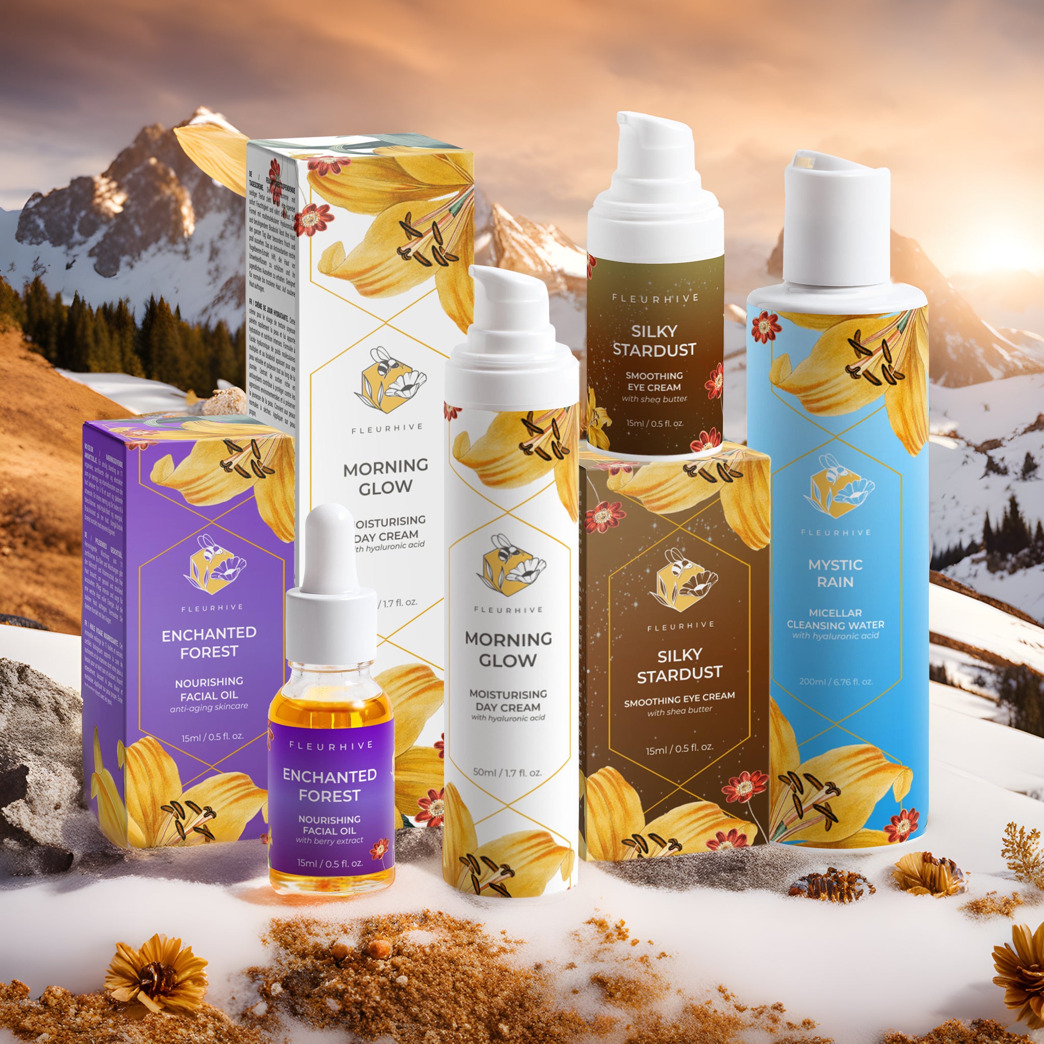 Begin your glow-up journey with a splash of Mystic Rain Micellar Water, gently removing any impurities and prepping your skin for a day of radiance. Follow up with the Morning Glow Moisturizing Day Cream, generously applying it to immerse your skin in a hydrating embrace. Don’t forget those eyes! A gentle pat of Silky Stardust Smoothing Eye Cream around them will ensure they sparkle and shine. As the stars come out, let Enchanted Forest Nourishing Facial Oil whisper sweet nothings to your skin, nourishing and pampering it through the night. Your path to glowing skin is just a bundle away!