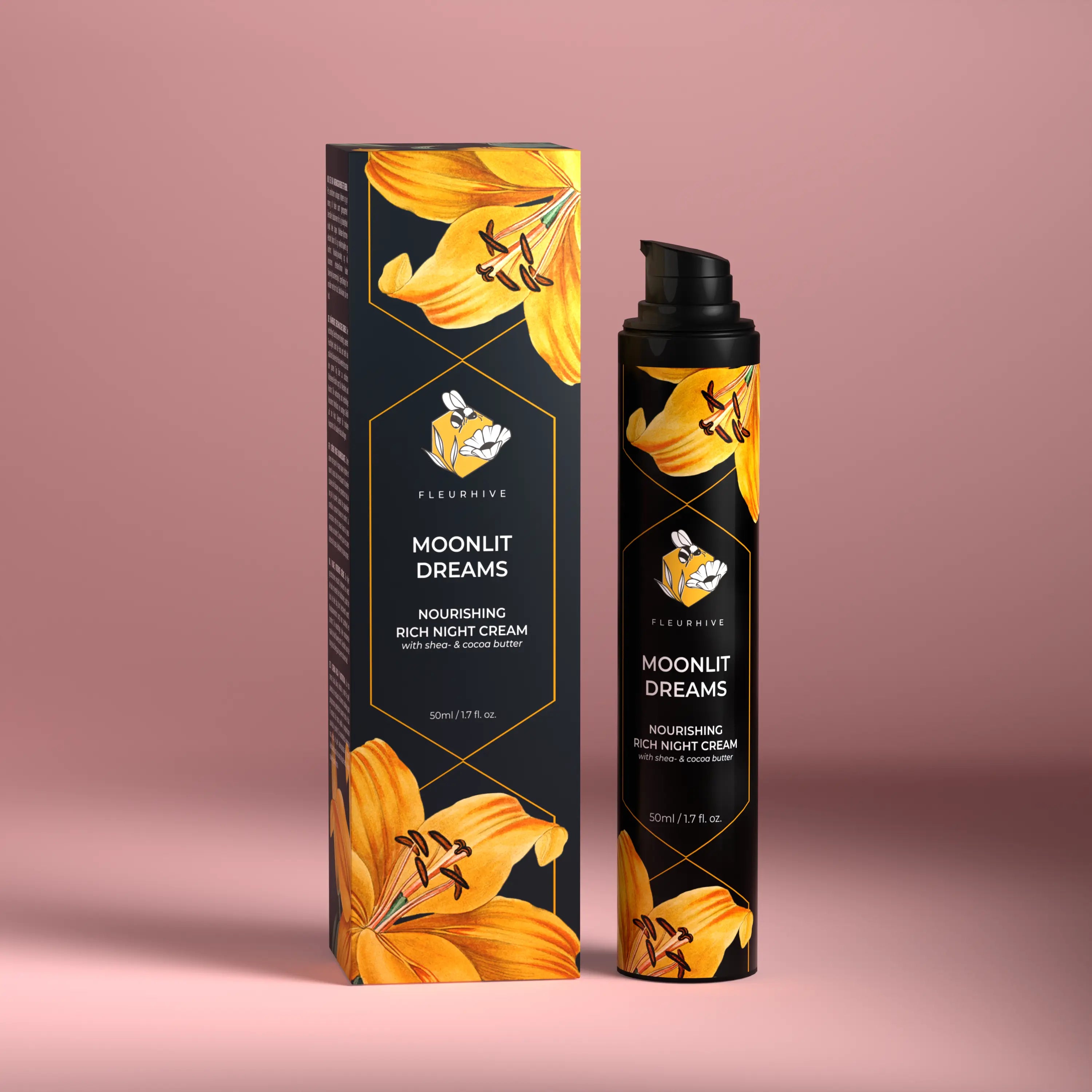 For an enhanced experience, cleanse your skin before bedtime. This sets the stage for the cream's magic. Dispense 2-3 drops of Moonlit Dreams onto your fingertips. Feel its luxurious texture as you gently massage it into your face and neck using upward strokes. Perfect for nighttime nourishment and rejuvenation. Let it be the last loving touch your skin receives before you drift into dreams...